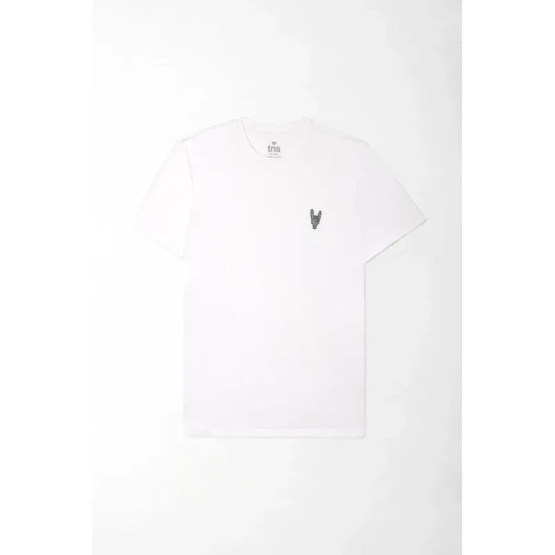 Esta camiseta gráfica TNS apuesta por lo esencial con actitud: base blanca de algodón 100% y un mini gráfico de mano rock al pecho que dice presente sin gritar. El cuello redondo y las mangas cortas mantienen un perfil limpio y fácil de combinar, perfecto para la ciudad. El fit regular cae recto, dejando que la prenda respire y que el arte sea el punto de identidad en tu básica blanca hombre.