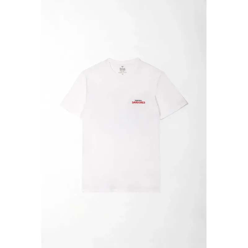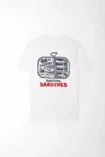 Pequeño print, gran actitud. Esta camiseta gráfica blanca apuesta por lo mínimo con intención: base en algodón 100% y un mini gráfico SARDINES al pecho en rojo que dice mucho sin robarse el look. El corte recto tipo regular fit mantiene una caída limpia y cómoda, mientras el cuello redondo clásico equilibra la vibra urbana con un acabado nítido. Resultado: una pieza fácil de combinar que suma identidad sutil y funciona todos los días.