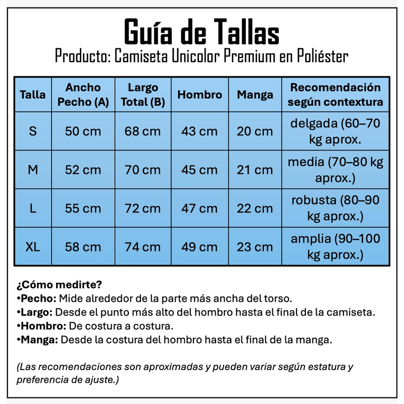 Nuestra camiseta unicolor premium está elaborada en poliéster extrasuave, pensada para quienes buscan comodidad, frescura y un look limpio todos los días. Su textura ligera y sedosa se adapta al cuerpo sin apretar, ofreciendo una caída elegante y una sensación agradable al contacto con la piel.
