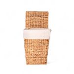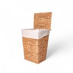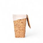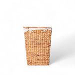 Canasto rectangular pequeño decorativo en jacinto de agua con manija y tapa, ideal para sala o comedor, su diseño contribuye al estilo de tu hogar. Cada pieza es artesanal y única.