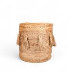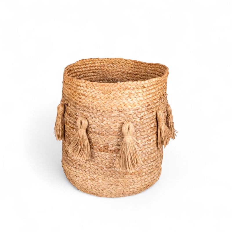Canasto redondo decorativo en yute de la colección Borlas, para sala o comedor su diseño contribuye al estilo de tu hogar.