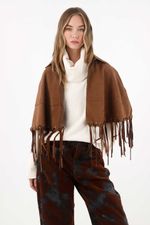 Capa en suede suave, con broche frontal y flecos largos que aportan movimiento y textura. Silueta suelta y envolvente.