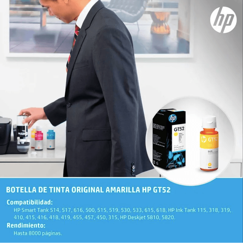 Referencia | Botella de Tinta HP GT52 Amarillo Modelo: M0H56AL Color: Amarillo Capacidad de impresión: Hasta 8.000 páginas (con cobertura estándar según pruebas de HP) Volumen: 70 ml Tipo de tinta: Tinta colorante (dye-based) Compatibilidad Compatible con impresoras HP con sistema de tanque de tinta: HP DeskJet GT 5810 HP DeskJet GT 5820 HP Ink Tank 310 / 315 / 319 HP Ink Tank Wireless 415 / 419 Ideal para usuarios que buscan un rendimiento confiable a bajo costo. Aplicaciones y rendimiento Ideal para impresión frecuente de documentos y gráficos en color. Colores brillantes, vivos y de secado rápido. Bajo costo por página, ideal para oficinas, estudiantes y negocios. Tecnología y sistema Tecnología de impresión HP Thermal Inkjet. Sistema de recarga limpio y sin derrames. Compatible con impresoras HP de tanque de tinta original (Ink Tank y GT series). Contenido del empaque 1 botella de tinta HP GT52 Amarillo (M0H56AL). Boquilla de precisión para rellenado. Manual de instalación rápida (puede variar según región). Beneficios Alta calidad de impresión con colores duraderos. Fácil recarga sin ensuciar. Tinta original HP: evita obstrucciones y protege la impresora. Parte del programa HP Planet Partners para reciclaje responsable. Dimensiones del producto Dimensiones aproximadas: 4,7 × 14,1 × 4,7 cm. Peso bruto: 110 g aprox. |