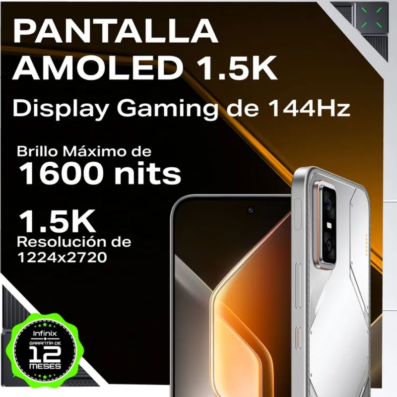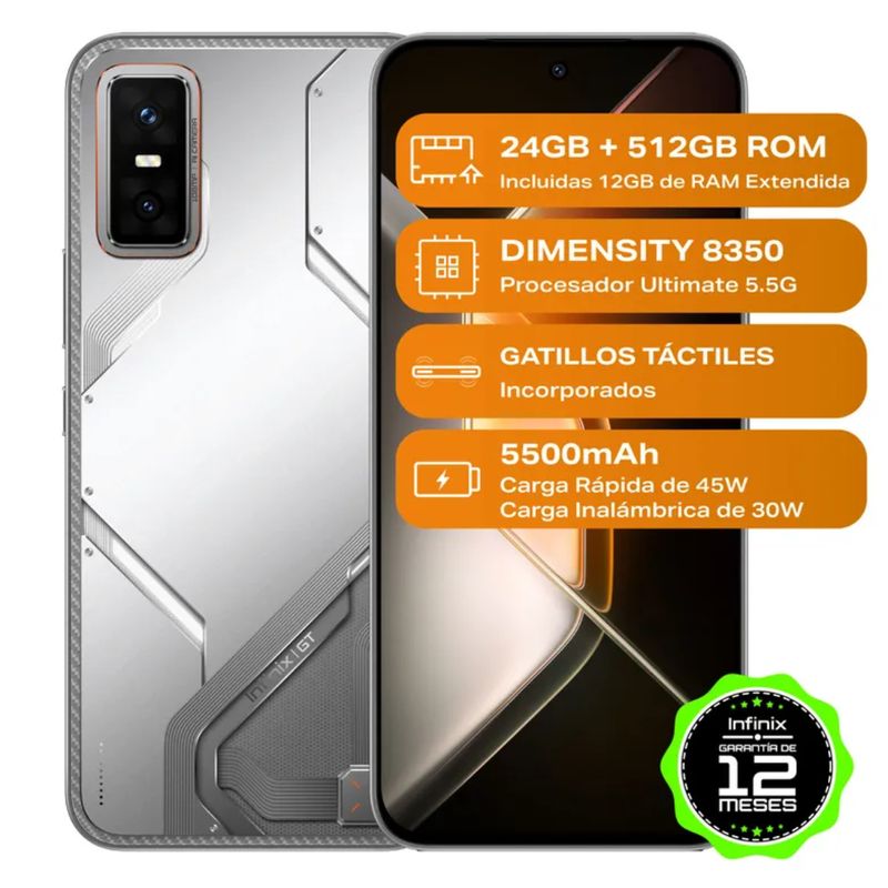 El Infinix GT30 Pro 5G es un dispositivo de última generación pensado para quienes buscan un equilibrio entre potencia, diseño y conectividad avanzada. Incorpora el procesador Mediatek Dimensity 8350 acompañado de 12GB de memoria RAM, ofreciendo una experiencia fluida incluso en juegos exigentes y aplicaciones de alto consumo. Su capacidad interna de 512 GB permite almacenar una gran cantidad de fotos, videos, aplicaciones y documentos sin preocupaciones de espacio.