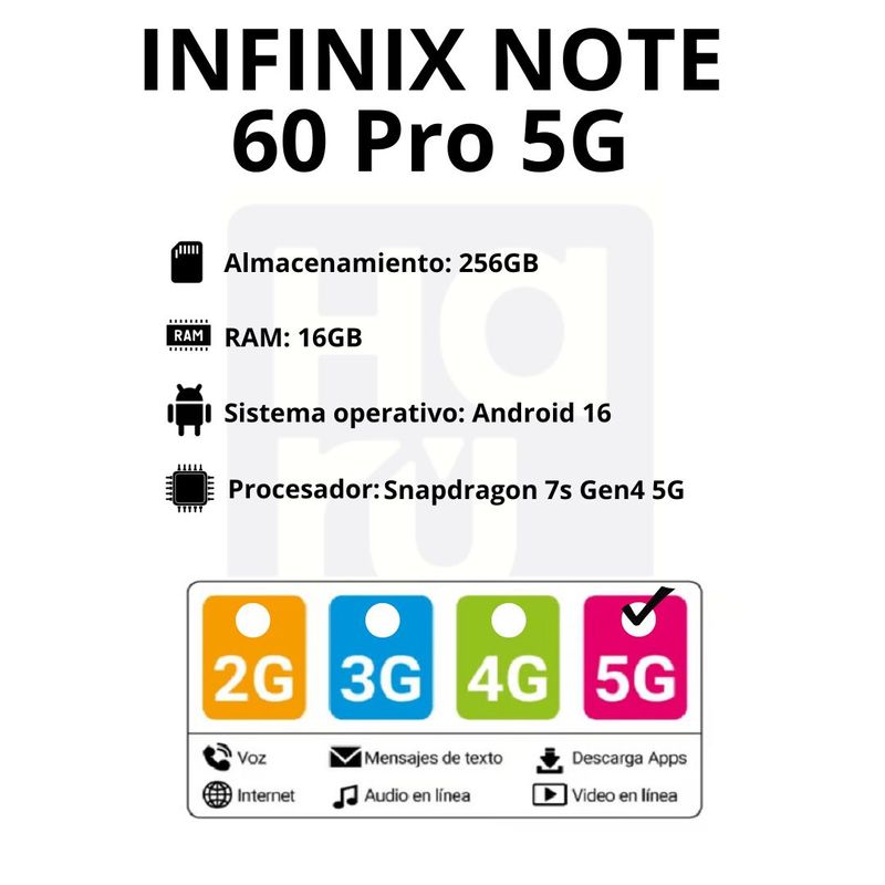 En la caja: Telefono infinix/ Cubo de carga/ Cable de carga/ Forro protector/ Pin de extraccion/ Manual/Audifonos