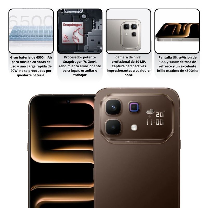 Procesador Snapdragon Pro 5G con un rendimiento de nivel superior hasta un 78% mas rapida para infinix. Diseñado para quienes buscan un rendimiento emocionante y utilidad diaria, ya sea para jugar, estudiar o trabajar. Lleva tus juegos favoritos a 120 FPS integrando. Gran bateria de 6000mAh, el mayor tiempo de funcionamiento y vida útil de la batería en la historia de NOTE, y una increible carga rapida de 90W.