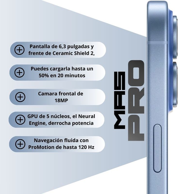 Chip A19, Gracias a la GPU de 5 núcleos, el Neural Engine mejorado potencia todo lo que haces en el iPhone, desde usar Apple Intelligence hasta disfrutar juegos AAA. Batería para todo el día que te ofrece hasta 30 horas de reproducción de video. Y puedes cargarla hasta un 50% en 20 minutos. Sigue en contacto a velocidades más rápidas con conexiones seguras a Wi-Fi 7, redes 5G y Bluetooth 6, y con la eSIM.