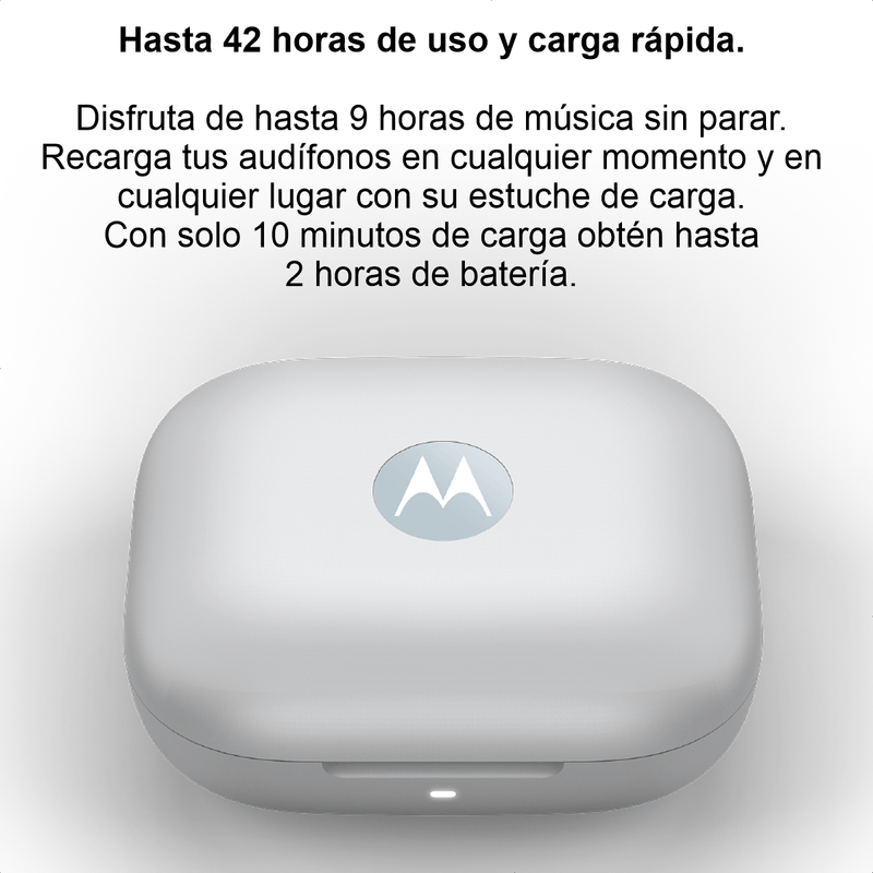 Disfruta de hasta 9 horas de música sin parar. Recarga tus audífonos en cualquier momento y en cualquier lugar con su estuche de carga. Con solo 10 minutos de carga obtén hasta 2 horas de batería.