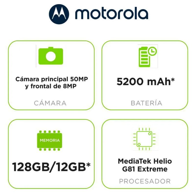 Este modelo destaca en fotografía gracias a su cámara trasera dual de 50 MP + 5 MP, que ofrece tomas claras incluso en condiciones de poca luz, y su cámara frontal de 8 MP para selfies y videollamadas. Su procesador MediaTek Helio G81 Extreme y sus 4 GB de RAM brindan un rendimiento confiable, mientras que sus 256 GB de almacenamiento interno aseguran espacio suficiente para tus archivos.