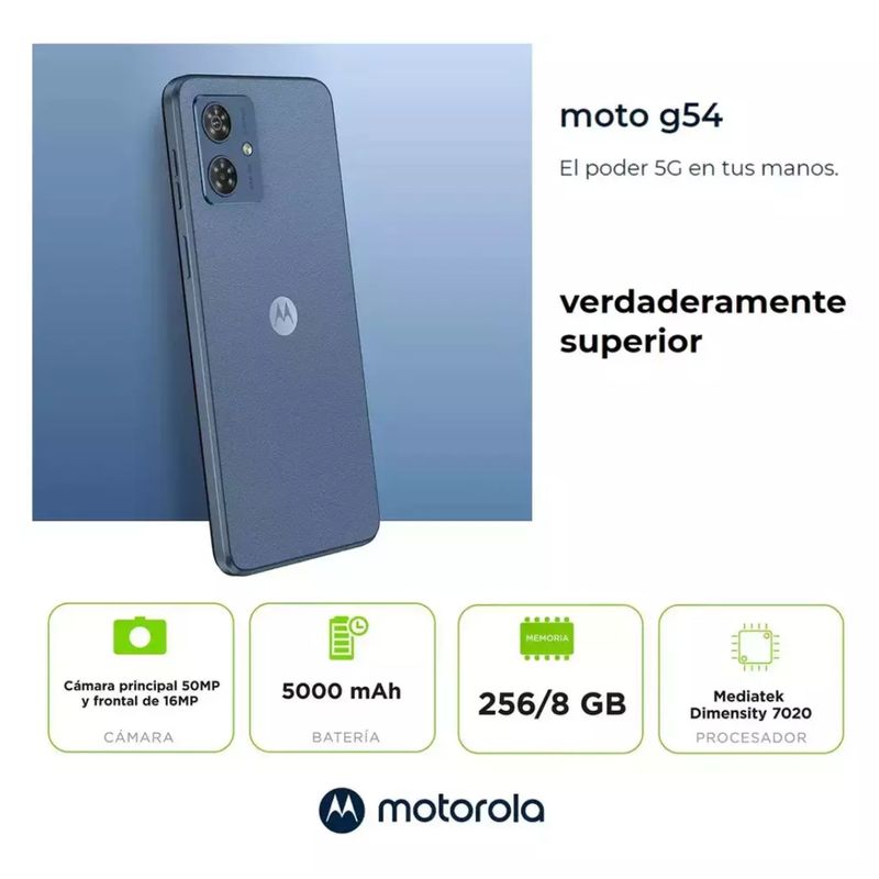 Con el procesador MediaTek Dimensity 7020, 8GB de RAM y 256GB de almacenamiento expandibles, el Moto G54 garantiza un rendimiento veloz y espacio suficiente para tu contenido. Su batería de 5000 mAh con carga rápida asegura energía prolongada para todo el día.