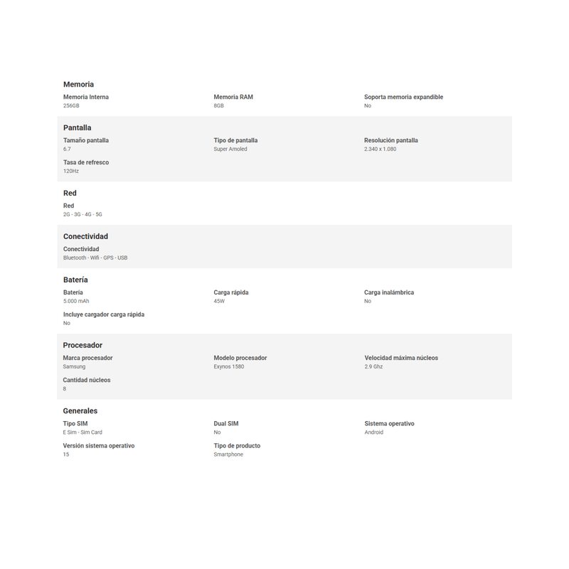 El Samsung Galaxy A56 es un smartphone que combina estilo y rendimiento en un dispositivo diseñado para aquellos que buscan una experiencia fluida y moderna. Con su procesador Exynos 1580 que alcanza una velocidad de hasta 2.9 GHz, disfrutarás de un funcionamiento rápido y eficiente, perfecto para tareas diarias y aplicaciones.