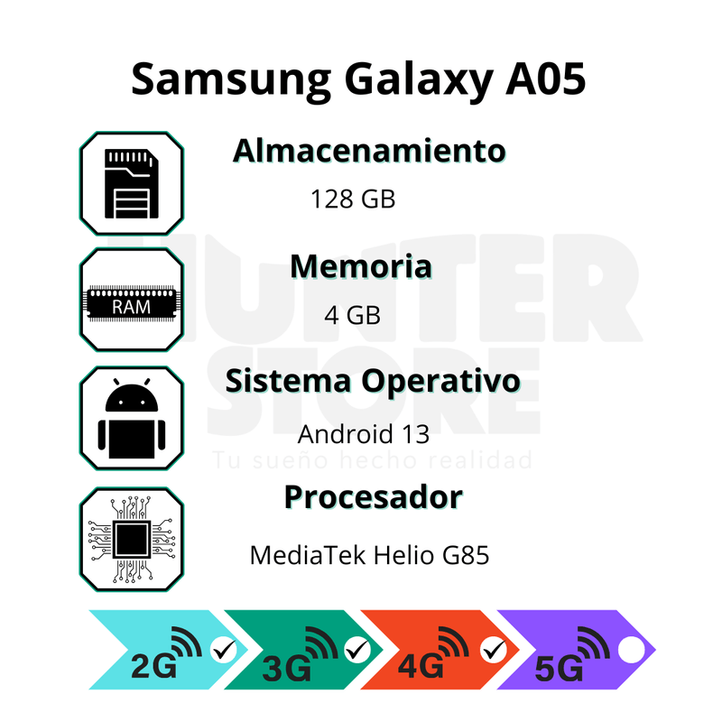 Rendimiento confiable, espacio de sobra y estilo en cada detalle. El Galaxy A05 te ofrece una experiencia fluida con 4GB de RAM y 128GB de almacenamiento para todo lo que te importa. Su diseño elegante en blanco lo hace perfecto para el día a día. Ideal para quienes quieren más por menos.