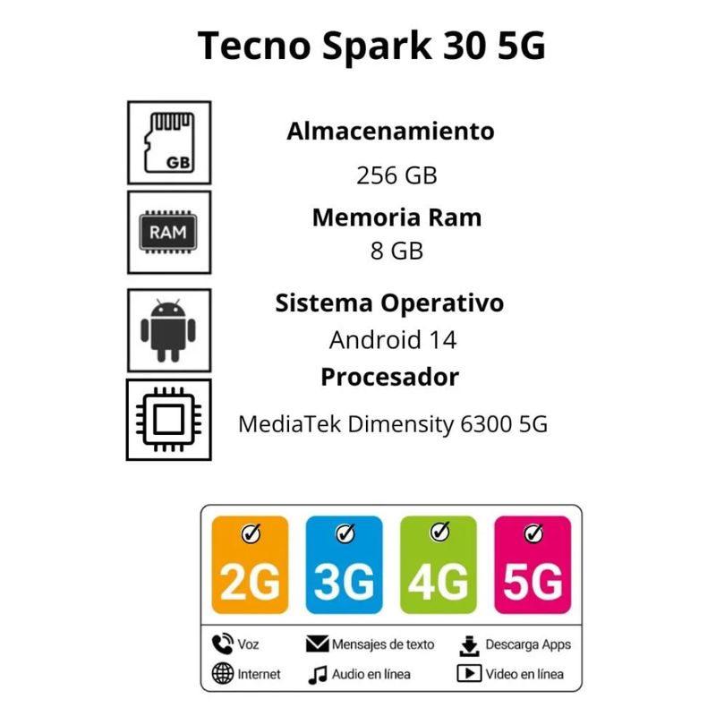 El Tecno Spark 30 5G es mucho más que un celular: es tu aliado para cada momento del día. Con su procesador Dimensity 6300 5G, podrás disfrutar de velocidad, conectividad y estabilidad en cualquier tarea. Su pantalla de 6.7 pulgadas con 120 Hz de refresco ofrece una experiencia visual fluida, ideal para quienes exigen calidad en su entretenimiento.