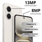 En el apartado fotográfico, integra una cámara trasera de 13 MP con flash que captura imágenes claras y detalladas, y una cámara frontal de 8 MP ideal para selfies y videollamadas. Además, incorpora modos inteligentes que ajustan brillo y color automáticamente para mejores resultados.