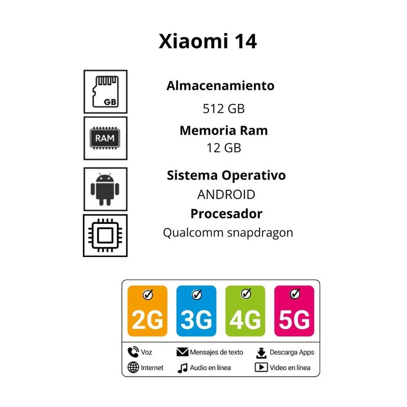 Incluye: Celular Xiaomi 14 - Adaptador - Cable USB tipo C - Funda protectora - Guía de inicio rápido - Extractor de SIM