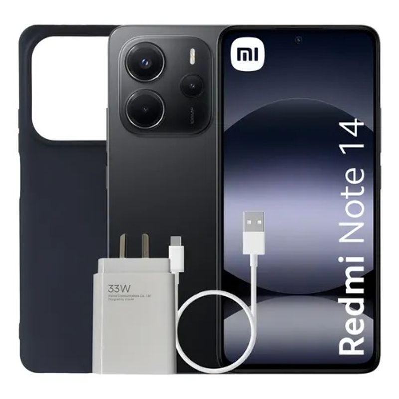 Redmi Note 14, cargador 33W, cable USB-C, herramienta para SIM, guía rápida.