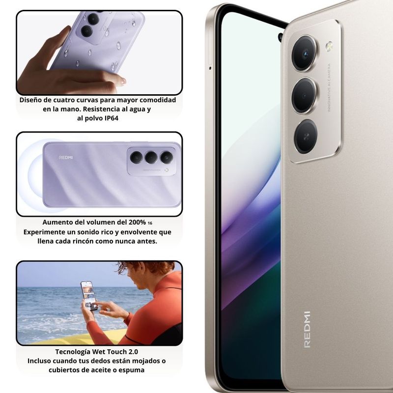 Sistema de cámara dual con IA de 50 MP. Disfrute de fotos nítidas y detalladas con la cámara principal de 50 MP y momentos fugaces con tomas dinámicas, que dan vida a las escenas cotidianas de una manera diferente. Redmi 15 es compatible con resistencia al agua y al polvo IP64, lo que proporciona una protección eficaz contra salpicaduras, polvo u otras situaciones esperadas.