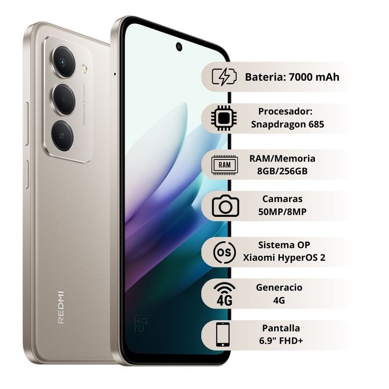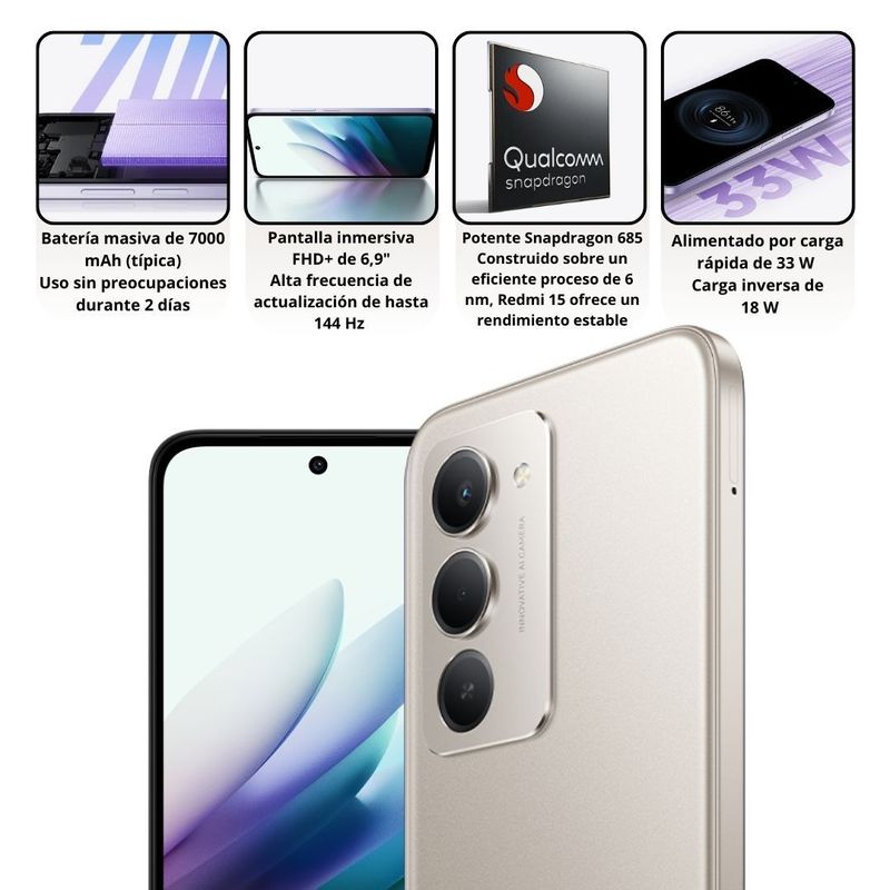 Batería Xiaomi Surge de 7000 mAh. Equipado con tecnología avanzada de ánodo de silicio-carbono, Redmi 15 ofrece una experiencia de duración de batería ultralarga como nunca antes. Incluso después de completar 1.600 ciclos de carga completos, la batería aún mantiene el 80% o más de su capacidad original. La carga turbo de 33 W te permite seguir adelante sin preocupaciones, logrando un equilibrio perfecto entre carga rápida y batería de larga duración. Pantalla inmersiva FHD+ de 6,9". Disfrute de una visualización envolvente con una claridad y un brillo sorprendentes que dan vida a cada momento, en interiores o exteriores.