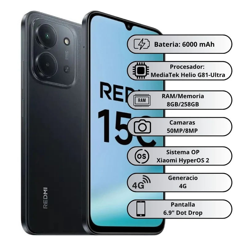 Descubre la potencia y la capacidad del Redmi 15C, un smartphone diseñado para quienes buscan un rendimiento excepcional sin complicaciones. Con una memoria interna de 256 GB y 4+4GB de RAM, podrás almacenar tus aplicaciones, fotos y archivos más importantes sin preocuparte por el espacio. Su procesador MediaTek Helio G81 Ultra, con una velocidad de 2 GHz, garantiza que disfrutes de una experiencia fluida y rápida en todas tus actividades diarias.