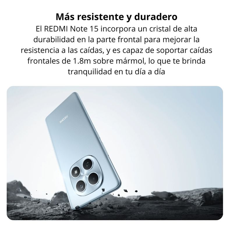 El Redmi Note 15 presenta un cuerpo estilizado con curvaturas ergonómicas que mejoran el agarre y la comodidad. Su estructura reforzada, junto con un cristal frontal de alta durabilidad, permite soportar caídas y el uso diario con mayor tranquilidad. Además, cuenta con certificación IP64 que lo protege contra polvo y salpicaduras.