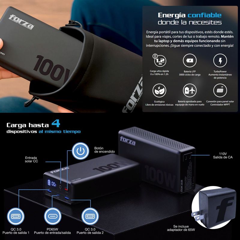 La nueva estación de energía portátil de 100W de Forza es tu compañera ideal para mantener todos tus dispositivos cargados y listos para cualquier situación Con un tiempo de carga ultrarrápido de solo 12h utilizando el cargador de 65W incluido esta estación de energía puede cargar hasta 4 dispositivos simultáneamente Su diseño compacto y liviano cumple con las regulaciones de la TSA para viajes aéreos