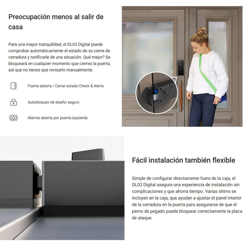 Para una mayor tranquilidad, el DL03 Digital puede comprobar automáticamente el estado de su cierre de cerradura y notificarle de una situación. Qué mejor? Se bloqueará en cualquier momento que cierres la puerta, así que no tienes que revisarlo manualmente.