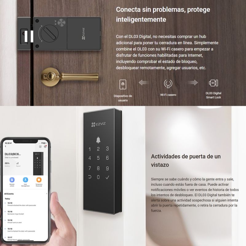 Hora de disfrutar de un acceso remoto y inteligente a tu casa. Con la ayuda de EZVIZás más reciente DL03 Digital Smart Lock, es una brisa para abrir la puerta. Puede introducir una contraseña, o deslizarse en su smartphone. Es fácil de instalar sin un centro, y es fácil de usar para todos los miembros de la familia. Ya sea que vivas en apartamentos o casas, o planees administrar alquileres, la cerradura es práctica con acceso digital que se puede personalizar para diferentes personas y propósitos. Caja fuerte por diseño, también te notifica sobre actividades sospechosas para proteger mejor tu hogar.