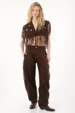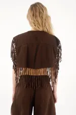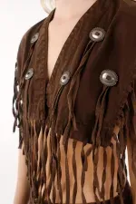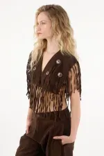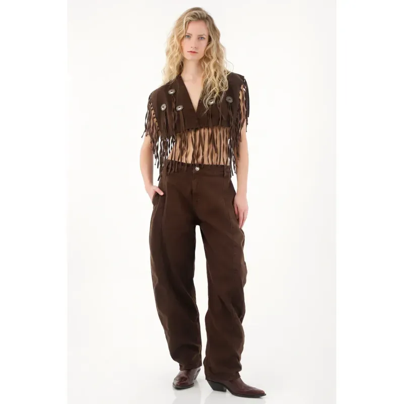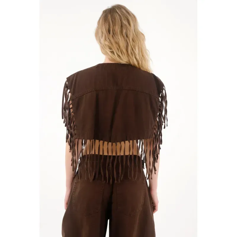 Este chaleco corto y abierto es esa tercera pieza que eleva tus looks con un estilo único. Su diseño incorpora múltiples flecos que aportan movimiento y personalidad, mientras que los taches decorativos le dan un toque audaz y moderno, perfecto para quienes aman destacar sin esfuerzo.