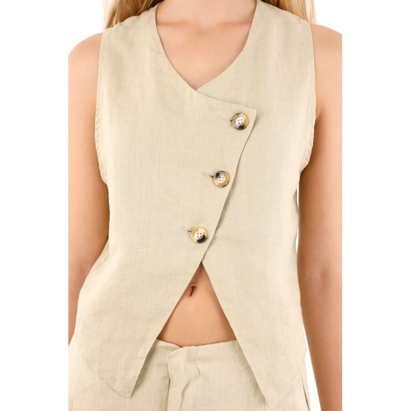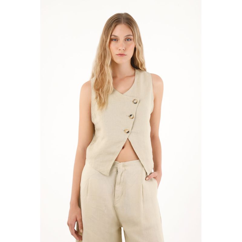 Chaleco en 100% lino con escote curvo café para mujer