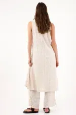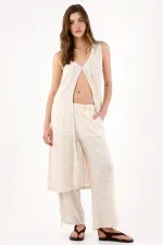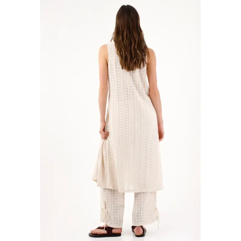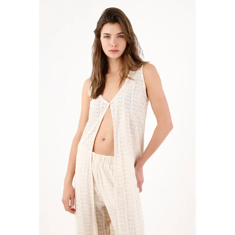 Un solo broche y todo fluye. Este chaleco largo para mujer se construye en encaje crudo con franjas verticales que aportan textura y estilizan la silueta. El escote en V profundo enmarca el torso y, con su cierre frontal único, deja una abertura limpia que suma movimiento y una actitud fresca. La silueta recta y suelta mantiene un look depurado, fácil de combinar y perfecto para el día a día urbano.