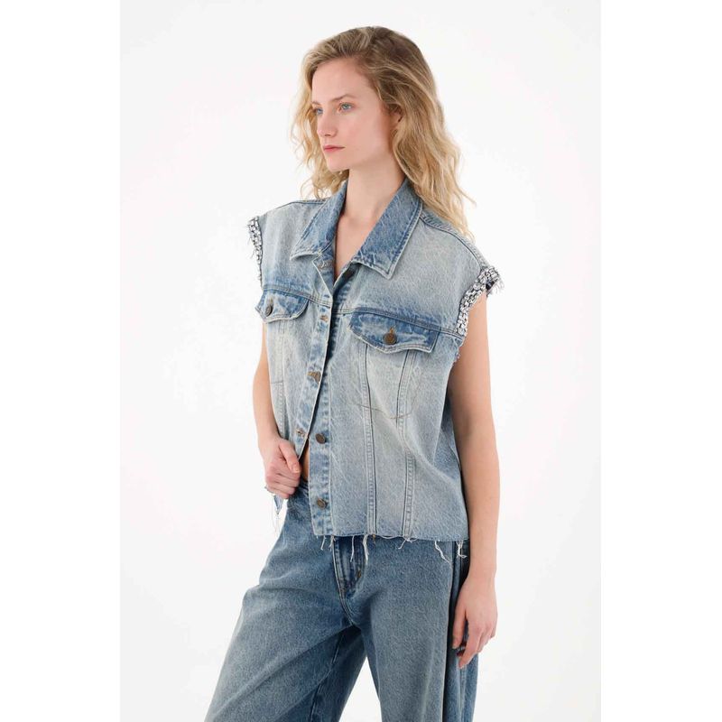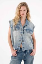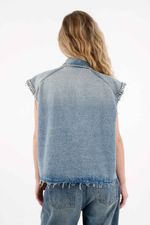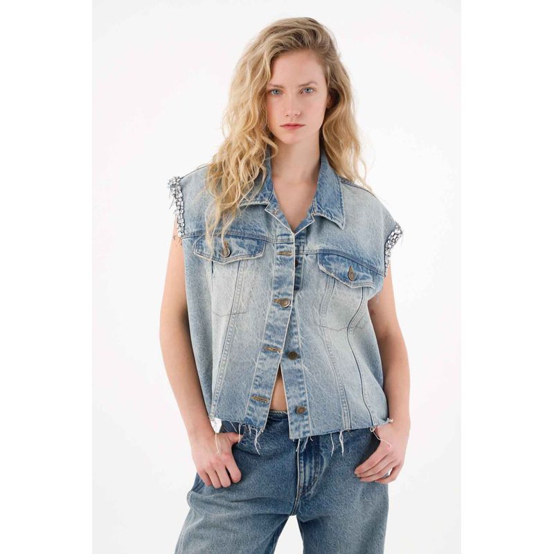 Este chaleco oversize en denim tono medio mezcla la actitud del street style con un toque de glamour inesperado. Las piedras en la sisa atrapan la luz y roban miradas, mientras su silueta amplia y relajada invita a jugar con las proporciones. Llévalo sobre una camiseta básica o anímate a usarlo como pieza principal con un crop ajustado, para un look que grita fashion confidence.