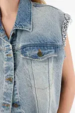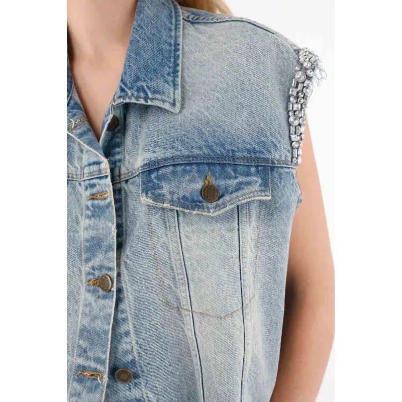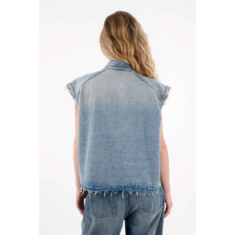 Confeccionado en denim tono medio 100% algodón, cuello clásico, perilla de botones y aplicación de piedras en la sisa que elevan su carácter urbano.