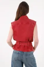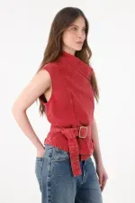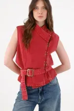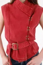 Cruza, ajusta y gana actitud al instante. Este chaleco cruzado para mujer en 100% algodón mezcla vibra urbana y comodidad real: el tejido tipo denim respira y mantiene la estructura, mientras el rojo lavado aporta ese toque desgastado que cuenta historias. El cruce asimétrico con pequeños herrajes laterales estiliza el torso y guía la mirada; el cinturón ancho con hebilla permite un ajuste a medida y dibuja una cintura definida con caída levemente peplum. Terminaciones limpias y silueta sin mangas lo convierten en un chaleco urbano versátil que funciona solo o en capas sin perder limpieza visual.