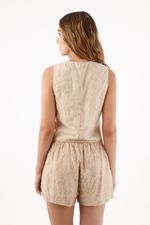 Este chaleco mujer beige en lyocell suma carácter con su textura floral tono sobre tono: capta la luz sutilmente para dar profundidad sin recargar. El escote en V limpia la línea del torso y estiliza el cuello. Los botones frontales marmoleados aportan un toque pulido urbano. Y el bajo en picos rompe la geometría clásica, dibujando una silueta moderna que se siente fresca. Forrado en viscosa para un acabado prolijo por dentro.
