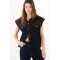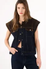 Hombros con actitud, denim con carácter. Este chaleco vaquero actualiza la silueta clásica con un canesú amplio en contraste que crea un efecto hombro-capa: estructura la parte superior y aporta presencia urbana. Los broches metálicos frontales suman ese guiño utilitario que tanto nos gusta, y las costuras en tono miel dibujan líneas verticales que afinan visualmente el torso. El tejido tipo denim en azul oscuro mantiene el look limpio y muy combinable.