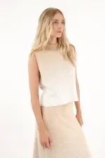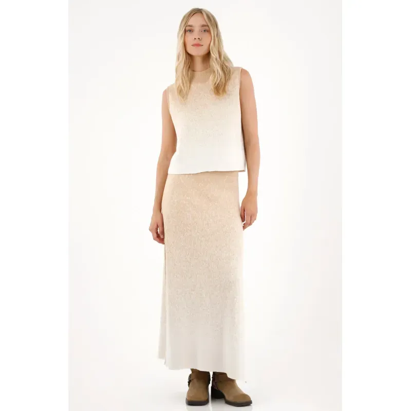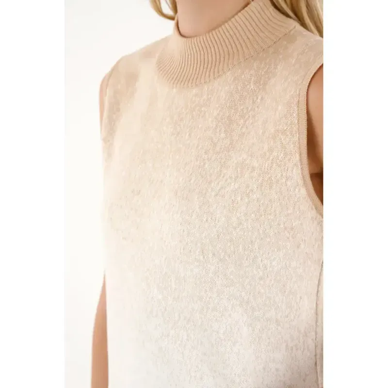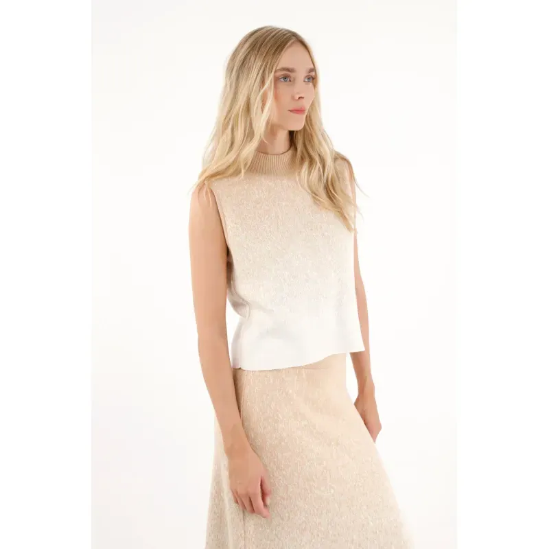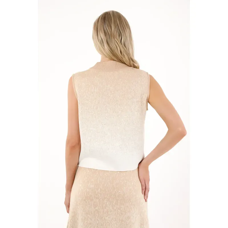 Su diseño degradé y cuello tortuga le dan un twist contemporáneo, mientras la manga sisa mantiene la frescura y versatilidad. Combínalo con tu falda favorita para un set coordinado, o úsalo solo sobre jeans o pantalones para un outfit casual-chic con actitud.