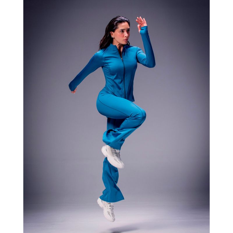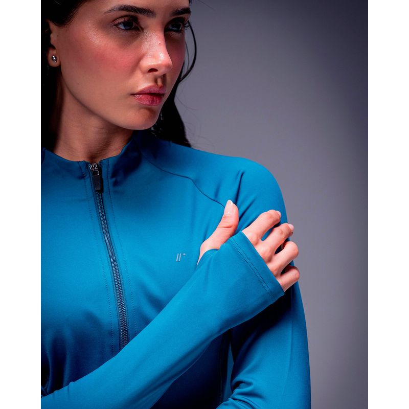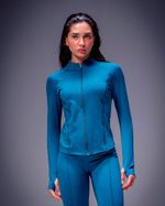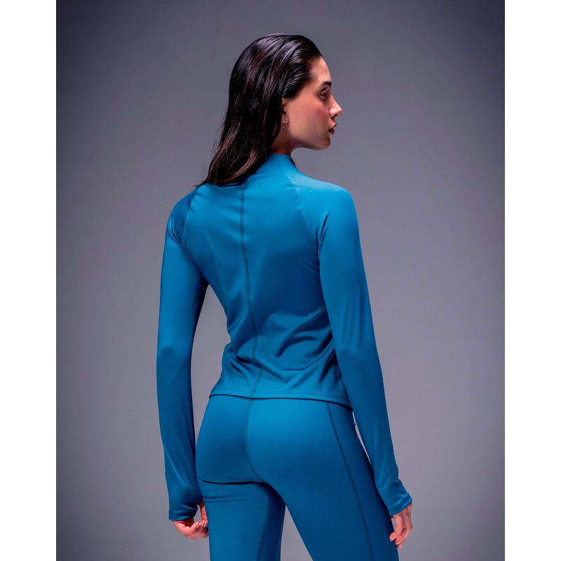 Chaqueta deportiva de silueta ajustada con mangas largas tipo ranglán y abertura tipo mitón para un mejor agarre. Cuenta con cuello integrado, cremallera separable al frente y cortes que realzan el ajuste al cuerpo. Diseño ideal para actividades de alto rendimiento o para tus sesiones en el gym.