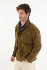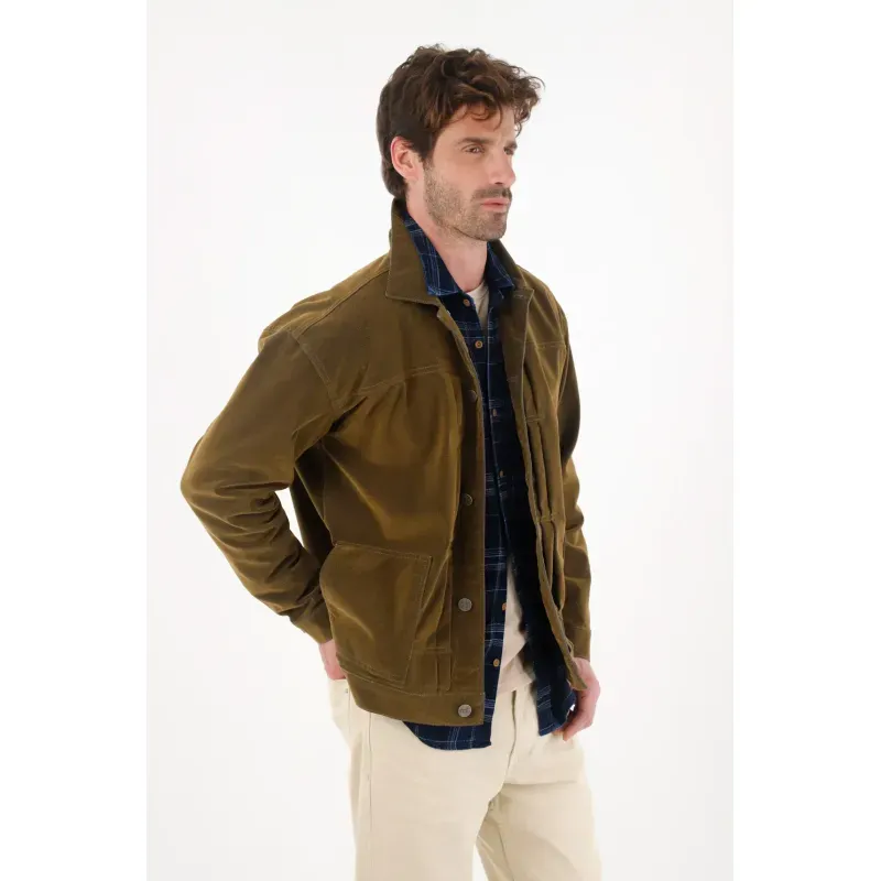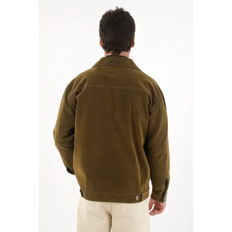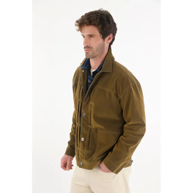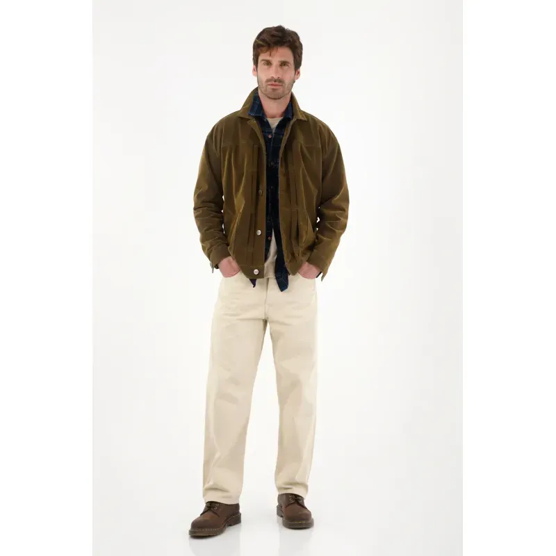 Diseñada en denim velvet color café, con estructura tipo trucker que mantiene su esencia atemporal. Las alforzas frontales y los bolsillos de parche refuerzan su silueta clásica, mientras la textura suave al tacto la convierte en una pieza clave para los días fríos.