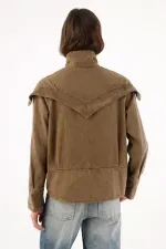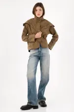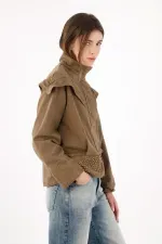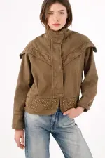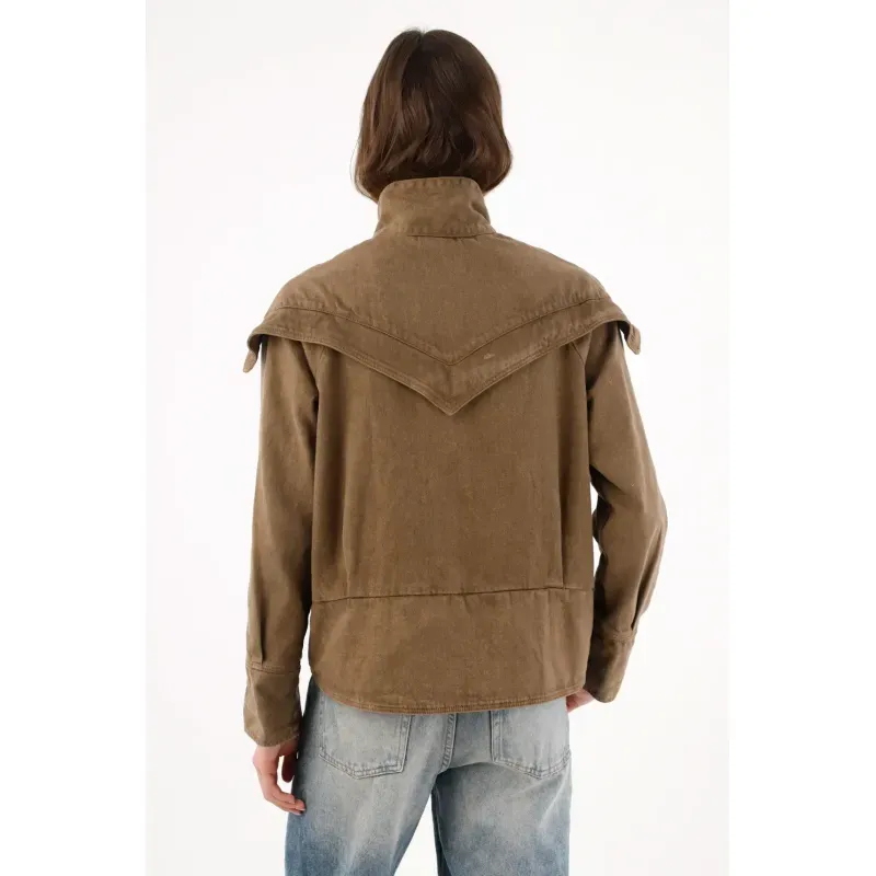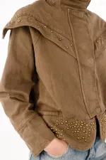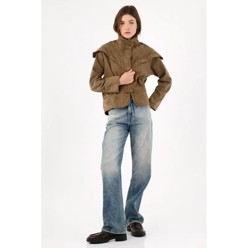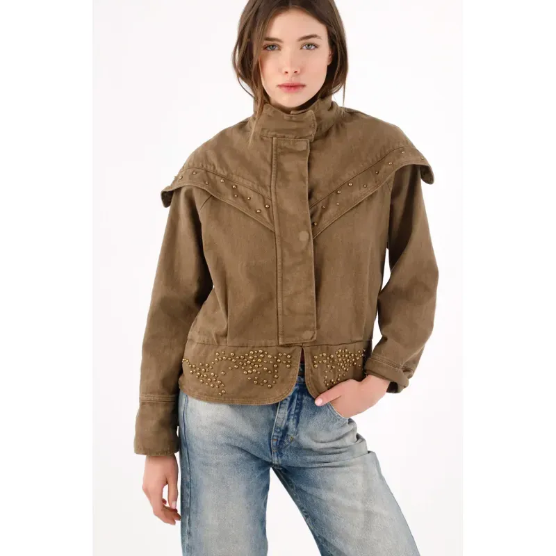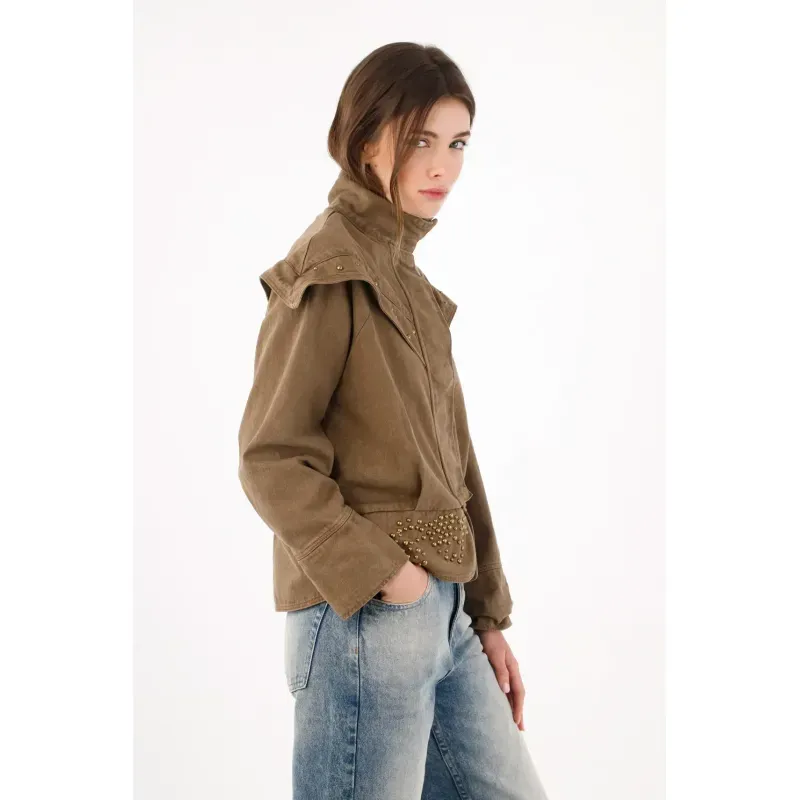 Una silueta urbana que se reconoce al primer vistazo: el yugo tipo capa cae sobre los hombros y pecho y se subraya con taches para un brillo medido que marca presencia. El cuello alto con tapeta de broches enmarca el rostro y suma carácter sin esfuerzo. En algodón kaki, mantiene un look limpio y fácil de combinar. El fit relajado y ligeramente corto equilibra proporciones, mientras el bajo con piezas curvas tachonadas aporta textura y un guiño creativo.
