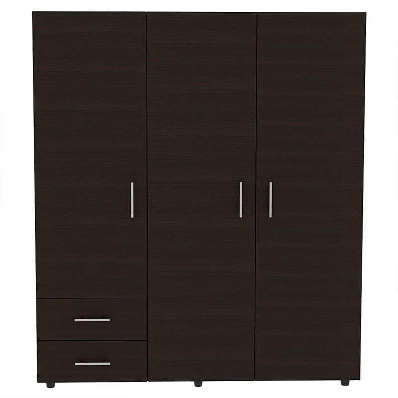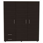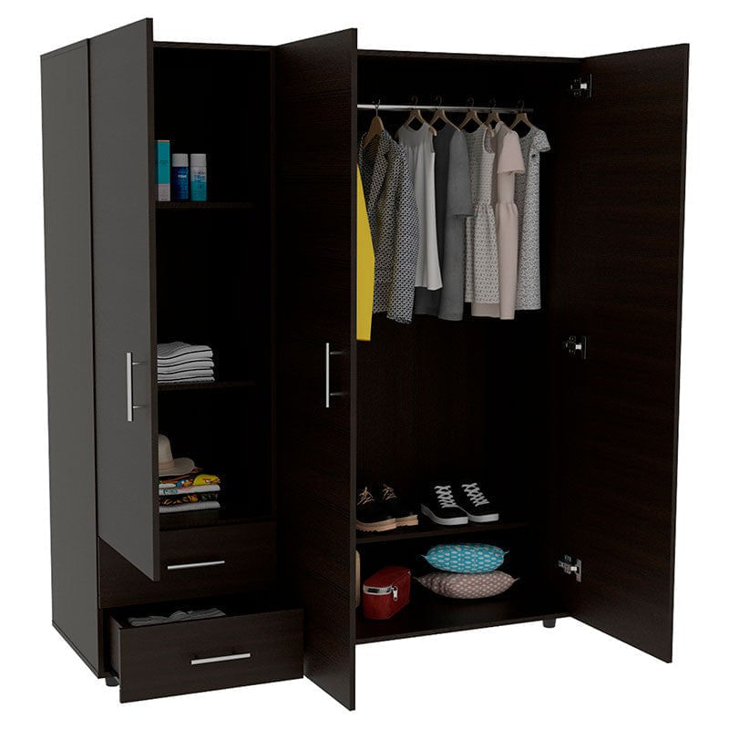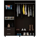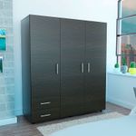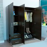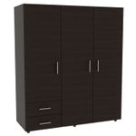 Closet, con 2 entrepaños para guardar y organizar la ropa, 3 puertas abatibles, 1 tubo cromado amplio para colgar ropa, 2 cajones organizadores multiusos, 1 Entrepaño diseñado para los zapatos, y manijas en acero inoxidable. Elaborado en Madera aglomerada MDP, recubierta con láminas melamínicas de excelente calidad, en color Wengue. Sus medidas son: Alto: 161,5 cm Ancho: 140 cm Fondo: 51,5 cm El tiempo de entrega de este producto es de 3 a 8 días hábiles. Su garantía es de 3 años en madera y 1 en herrajes. Pregunta ya por nuestro servicio de armado y envío gratis. Importante: Este producto no incluye elementos decorativos ni ambientación.