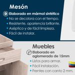 Recomendamos complementar esta cocina con la canastilla de 4 pulgados de acero inoxidable, las imágenes son un modelo ilustrativo del producto y puede presentar algunas variaciones con respecto a la realidad, Los muebles de la cocina vienen desarmados en caja. El mesón se entrega sin perforaciones de grifería, lo cual da la posibilidad de elegir dónde perforar según la dirección deseada del lavaplatos. El mesón viene separado del Mueble Inferior para que se pueda sobreponer y colocar al lado izquierdo o derecho del mueble.