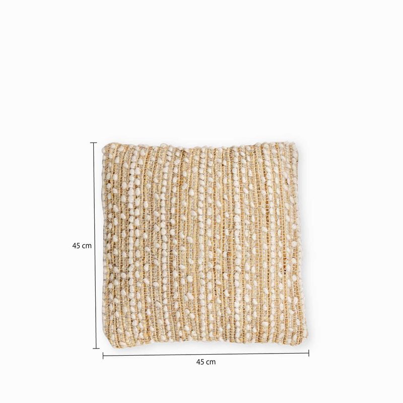 Cojín decorativo con tejido natural en yute, lana y algodón. Caracterizado por sus líneas geométricas de color beige y natural, que aportan encanto artesanal y diseño a los diversos espacios como salas de estar, alcobas y muebles con calidez y naturalidad.