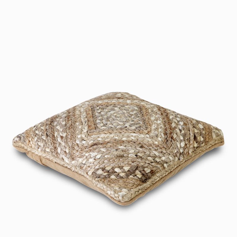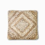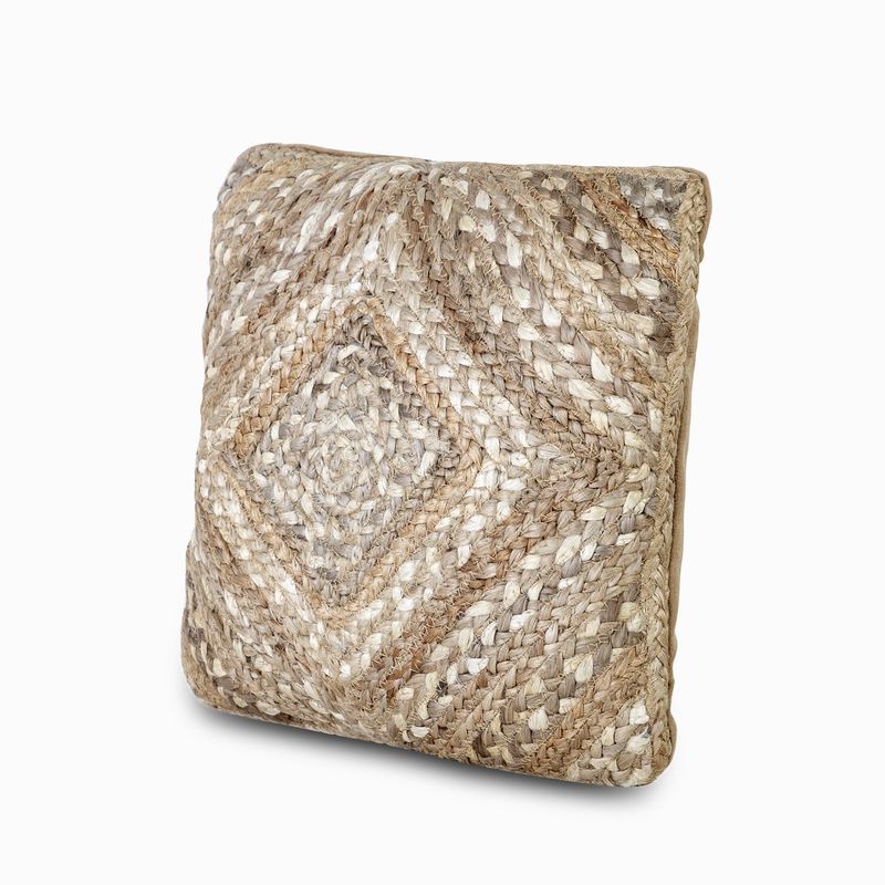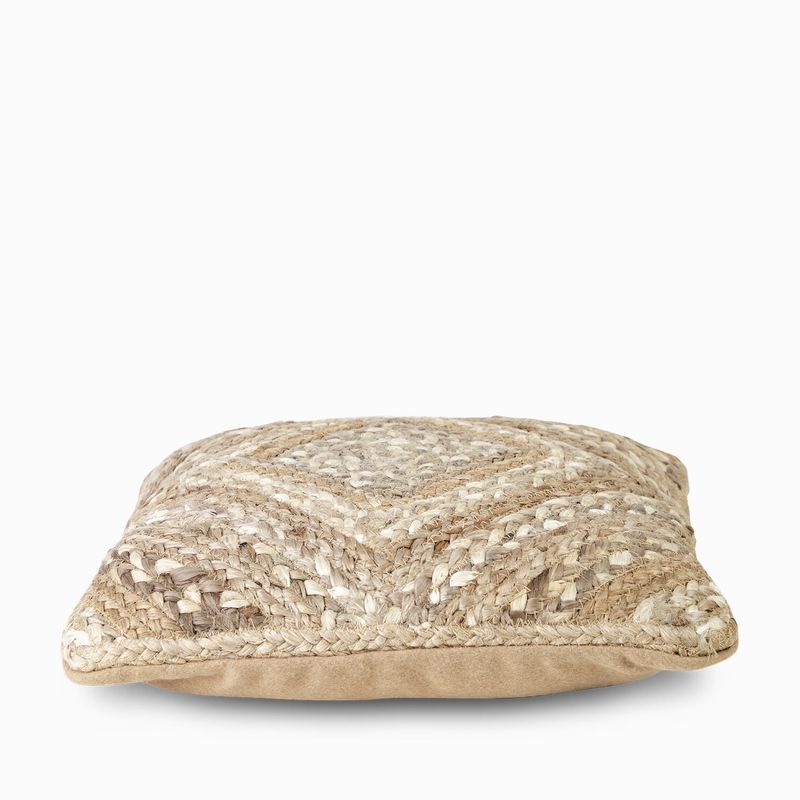 Cojín para sala o alcoba en yute con diseño geométrico, esta pequeña pieza tiene el poder de renovar y dar vida a los espacios sin necesidad de cambiar los muebles.