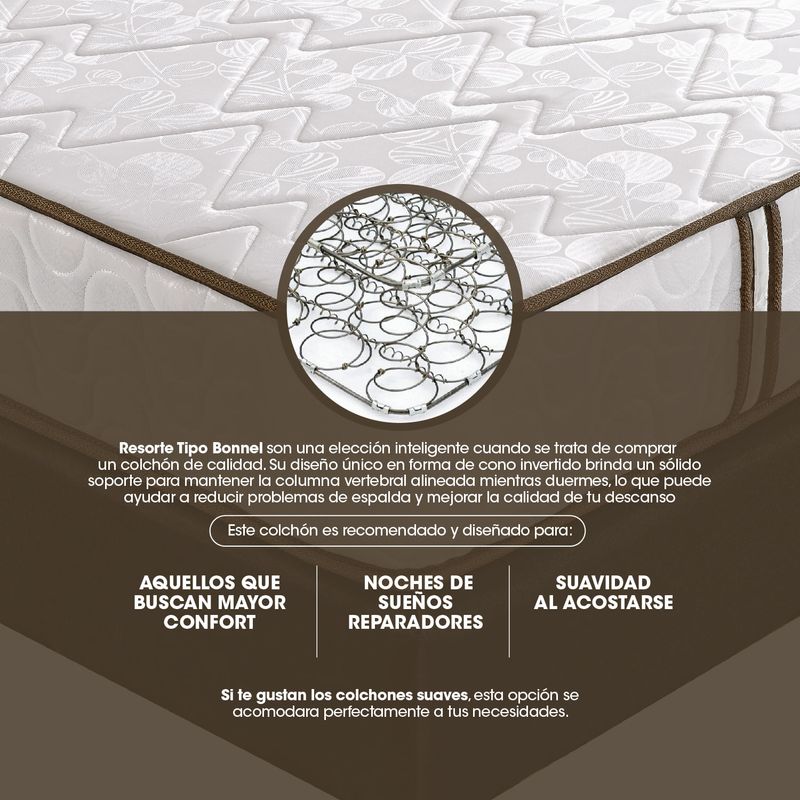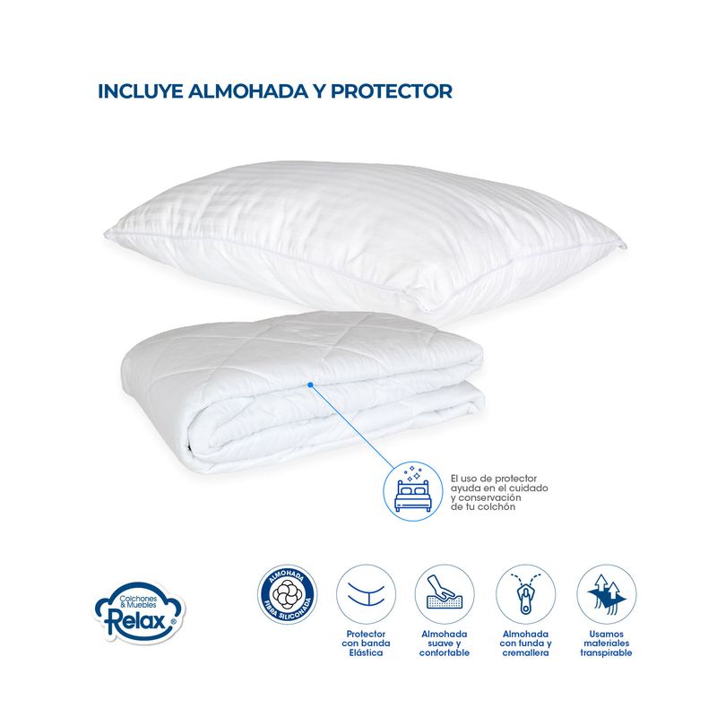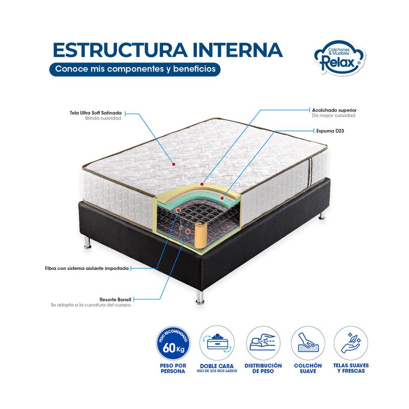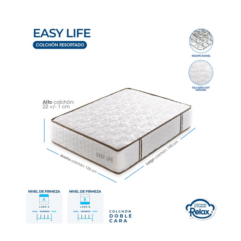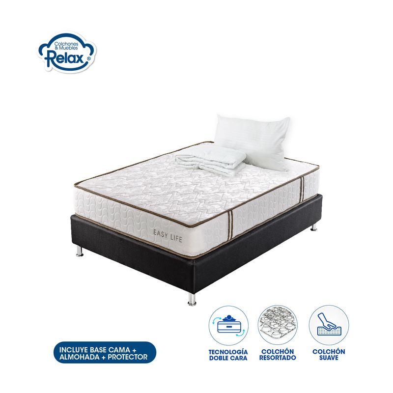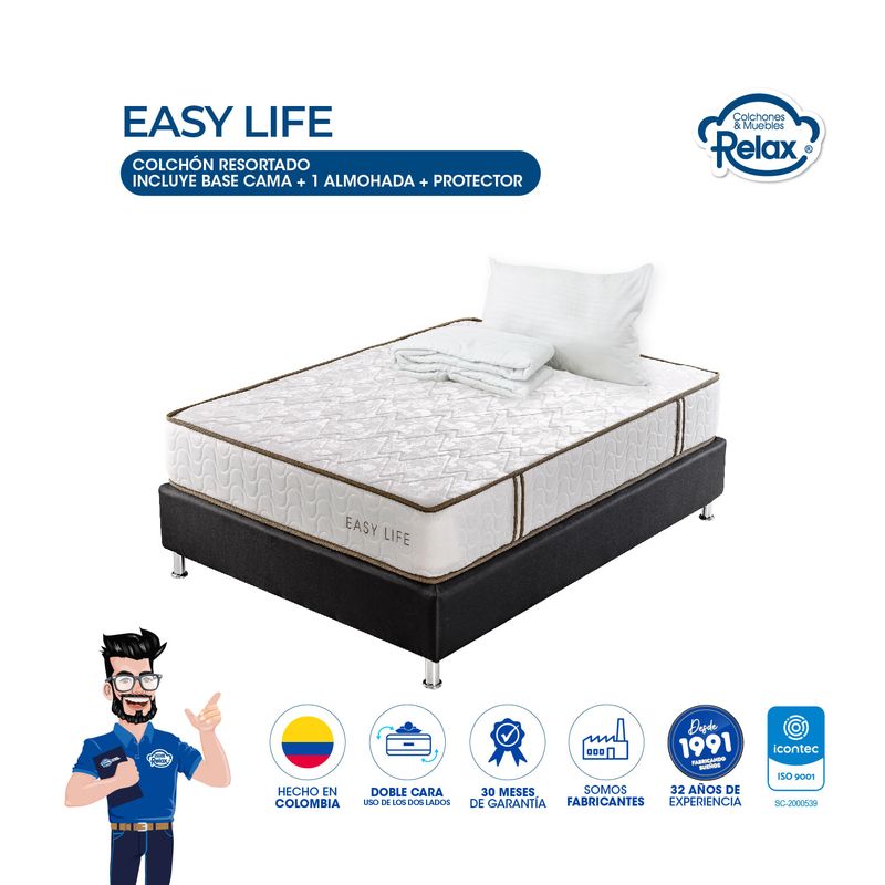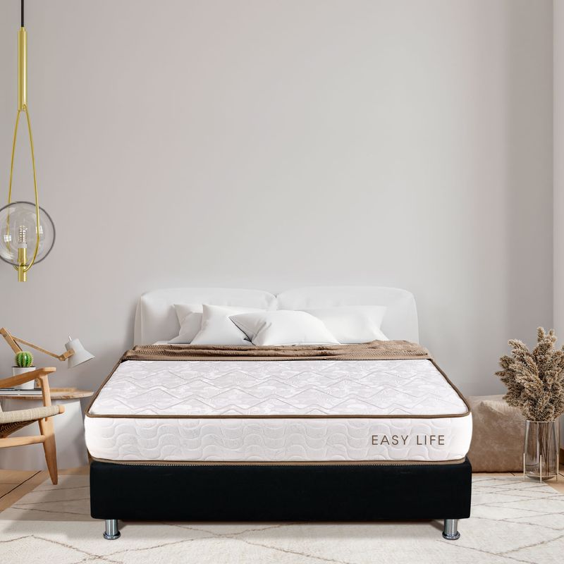 Disfruta de una comodidad excepcional con nuestro Colchón Easy Life en conjunto con una sólida base cama. Este colchón suave y satinado, diseñado para soportar 60 kg por persona, te brinda una experiencia de sueño diferenciada. La base cama agrega estabilidad y apoyo adicional, asegurando que cada noche sea un placer y te levantes revitalizado cada mañana. Con almohadas y un protector de colchón incluidos, este combo completo ofrece un descanso sin preocupaciones. No dejes pasar la oportunidad de transformar tu dormitorio en un santuario de lujo y comodidad. Tu bienestar es nuestra prioridad. ¡Consigue este combo hoy mismo!