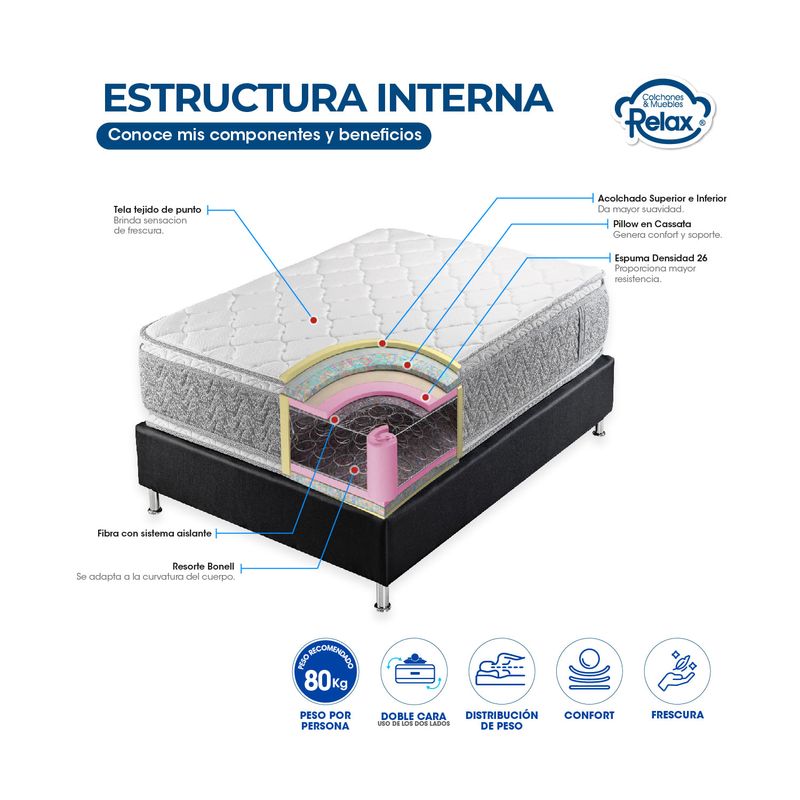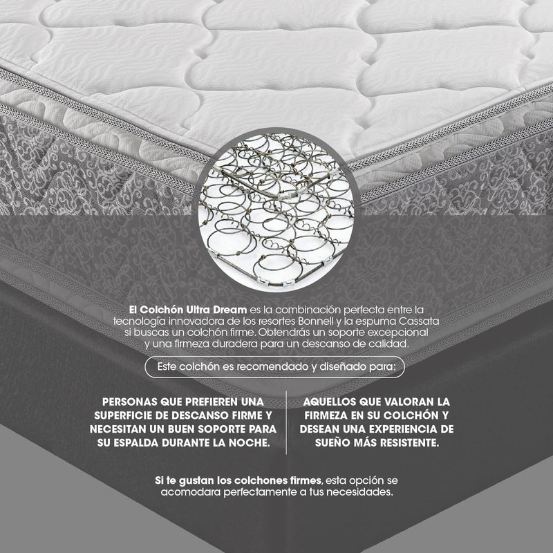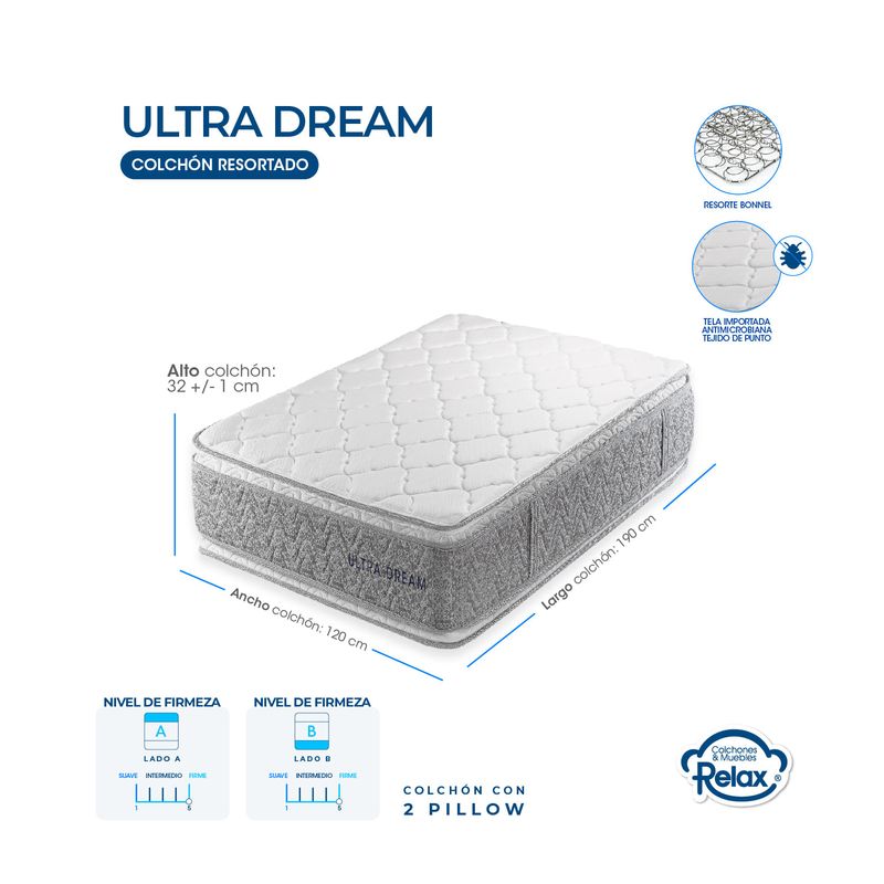 Experimenta el sueño de ensueño con nuestro Colchón Ultra Dream, diseñado meticulosamente con resortes Bonell y una capa de espuma Cassata que brinda firmeza y comodidad excepcionales. Presenta una altura de 32 cm y un elegante diseño en tono blanco con toques de gris, que aporta un toque moderno y sofisticado a tu dormitorio. Confeccionado con tela tejido de punto antimicrobiana Soft de última tecnología, te brinda un ambiente de sueño más saludable al eliminar ácaros y bacterias. Y eso no es todo, al adquirir este colchón, recibirás una sólida base cama que complementa a la perfección sus características, proporcionándote estabilidad adicional para un descanso de lujo. Descubre el equilibrio perfecto entre firmeza, comodidad y soporte, y disfruta de noches de descanso excepcionales con nuestro Colchón Ultra Dream.