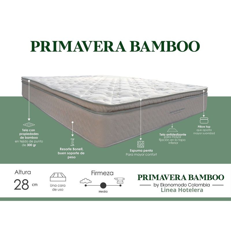No dejes que la calidad de tu descanso sea una preocupación. Con nuestros colchones, soñar plácidamente es posible. Elige el diseño perfecto para ti.Colchón Primavera Bamboo para Cama King.