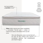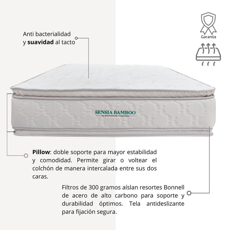 Descansa en un colchón de calidad superior que garantiza frescura, suavidad y protección antibacterial gracias a su tela acolchada de 300 gramos con propiedades de bamboo. La espuma en PENTA Densidad 26 de 3 cm ofrece un soporte óptimo y durabilidad excepcional. Los resortes Bonnell, fabricados en acero de alto carbono, aseguran resistencia, firmeza y adaptación ortopédica. Con una tela antideslizante para fijación segura. El colchón de 2 pillow es una característica de ciertos colchones que proporciona un doble soporte para mayor estabilidad y comodidad. Permite girar o voltear el colchón de manera intercalada entre sus dos caras, lo que aumenta su vida útil al distribuir el desgaste de manera uniforme. Esto ayuda a mantener la firmeza y el confort, previniendo deformidades y hundimientos, y favoreciendo una mejor postura y calidad de sueño para el usuario.