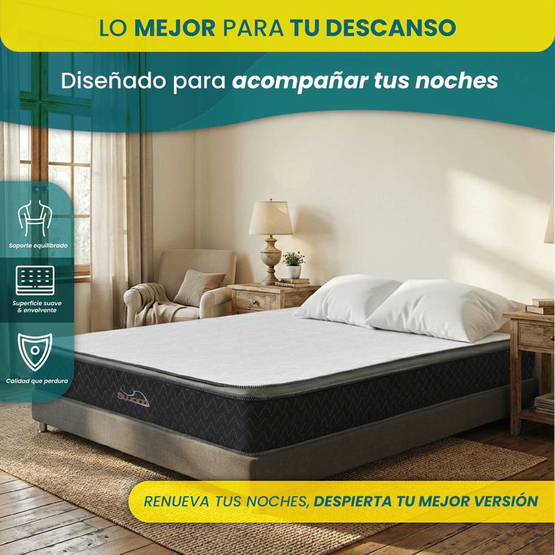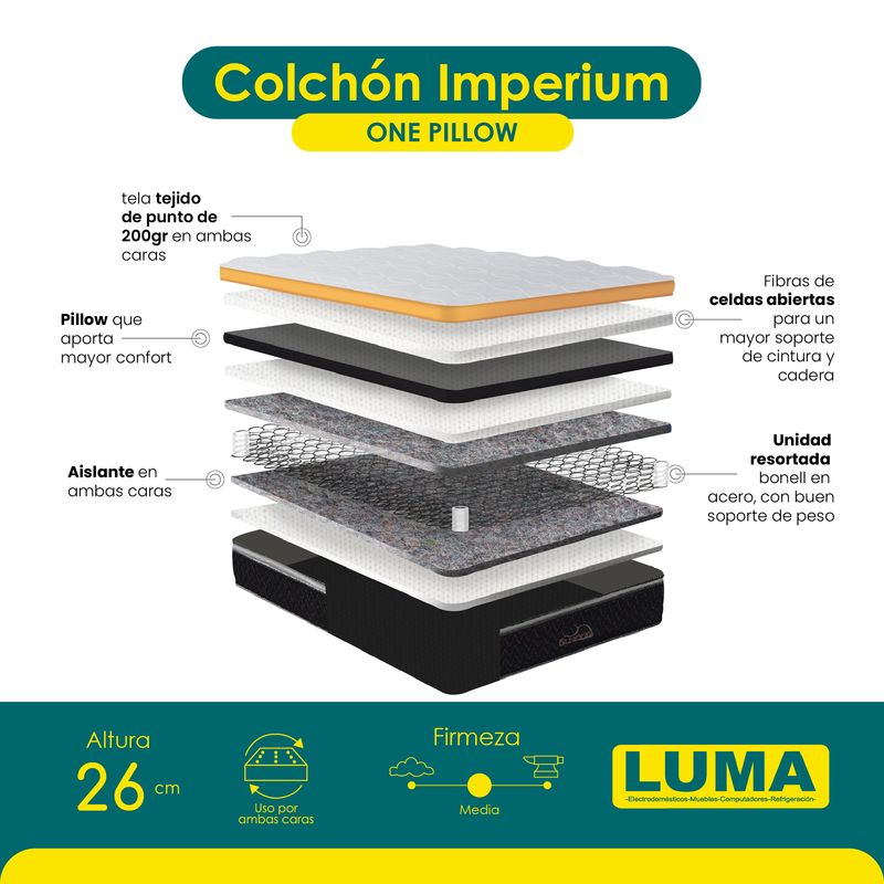 ColchónSwan Imperium One Pillow– Soportereforzadopara uso diario Colchón one pillow con altura de 26 cm, está diseñado para personas depeso medioque buscan un mayor nivel de soporte y estabilidad para el descanso diario. Su unidadresortadaofrece una estructura interna más robusta, brindando una sensación firme y segura al dormir. Uso recomendado: Personas de peso medio, Uso diario, Usuarios que requieren mayor soporte que un colchón básico.