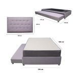 - Dimensiones: Cama principal de 120 cm de ancho x 190 cm de largo x 35 cm de alto; cama auxiliar de 110 cm de ancho x 178 cm de largo