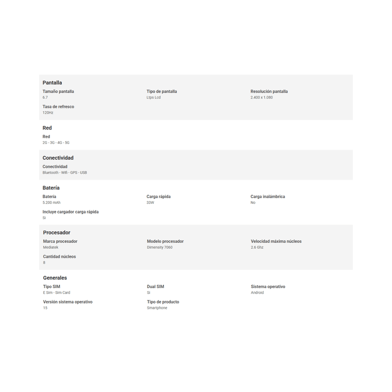 Este modelo cuenta con una ranura para tarjeta SIM y una eSIM, lo que facilita la gestión de líneas telefónicas. Con la capacidad de conectarse a redes 5G, el Motorola G56 5G ofrece velocidades de descarga y carga excepcionales, ideal para streaming y juegos en línea. Su sistema operativo Android proporciona acceso a una amplia gama de aplicaciones y personalización.